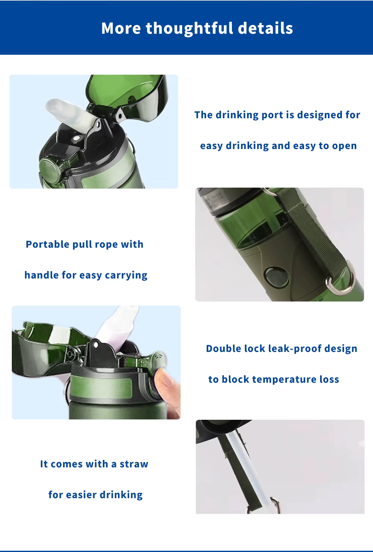 A precision-engineered double-lock leak-proof design ensures no spills, providing peace of mind in your bag or pack. The bottle also comes with a convenient straw for easy drinking and a portable pull rope with a handle for effortless carrying on the go.=